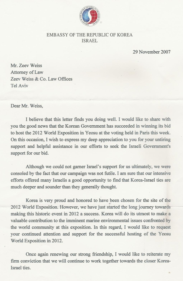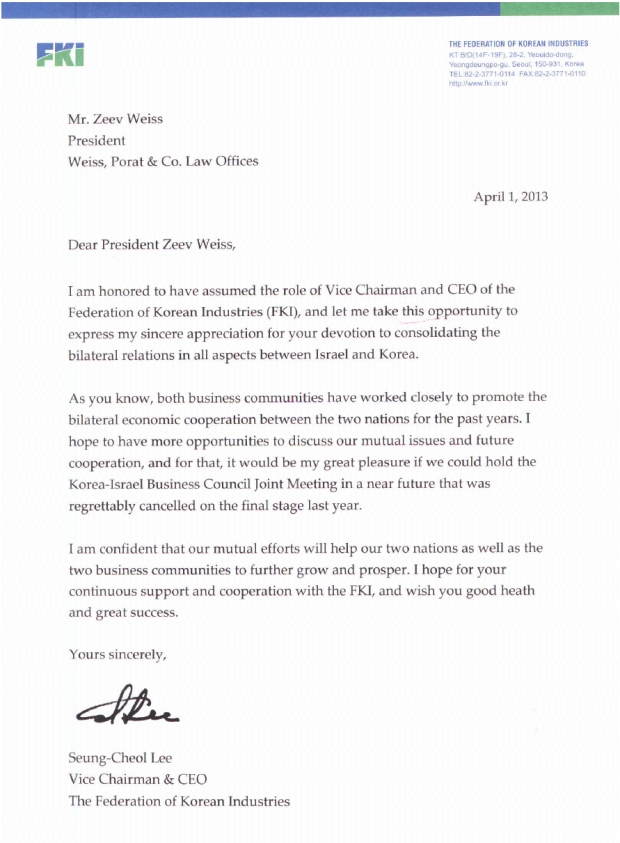 מכתב מהתאחדות התעשיינים הקוריאני